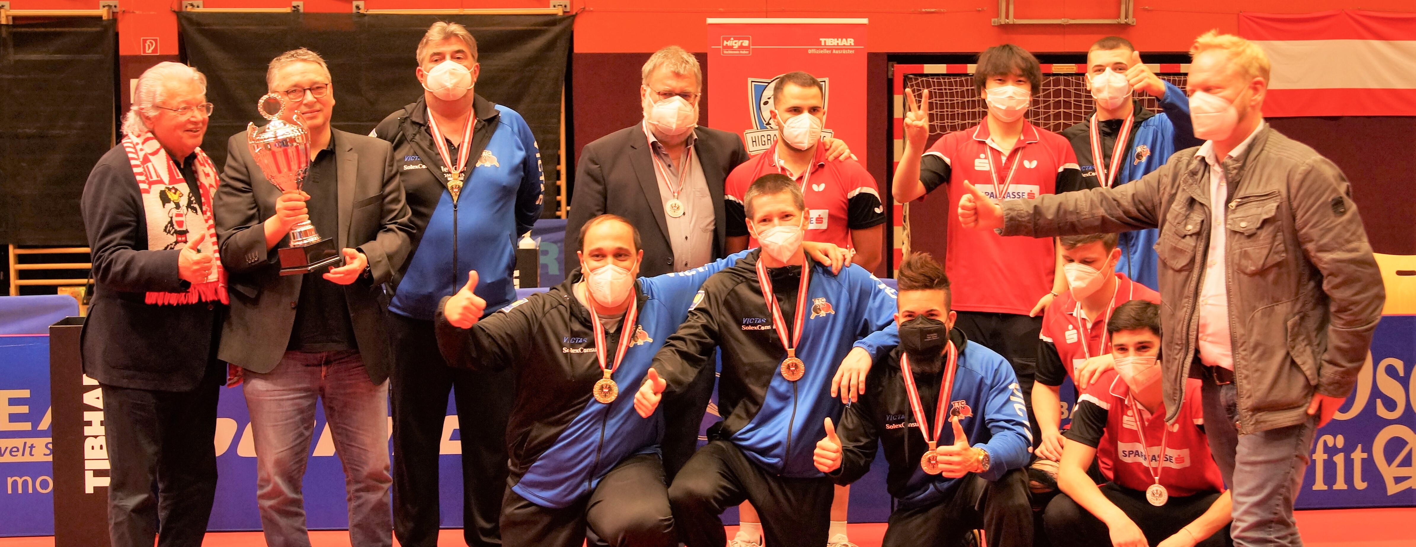 Kurz vor Mitternacht sollte es soweit sein – Felix Wetzel holt den entscheidenden Satz zum Titelgewinn! Doch allein schon, dass sich diese beiden Teams im Finale gegenüberstanden, sorgte für eine gewisse Überraschung. Sparkasse Salzburg eliminierte im Halbfinale den großen Favoriten Walter Wels, SolexConsult TTC Wiener Neustadt spielte sich im Grunddurchgang nach Platz 6 im Herbst noch auf Position 2 und setzte sich im Halbfinale gegen Stockerau durch.